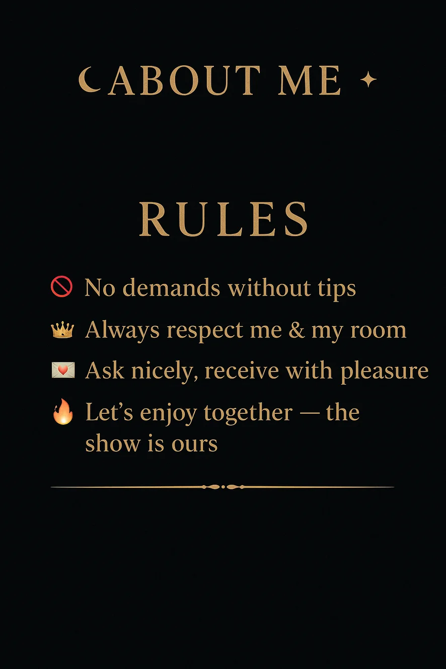 Spanking, Camel Toe, Erotic Dance, Cuckold, Dirty Talk, Doggy Style, Cock Rating, Mistress, Foot Fetish, Nipple Toys, Topless, Yoga, Orgasm, 69 Position, Oil Show, Anal Toys, Role Play, Jerk-off Instruction, Striptease, Shower